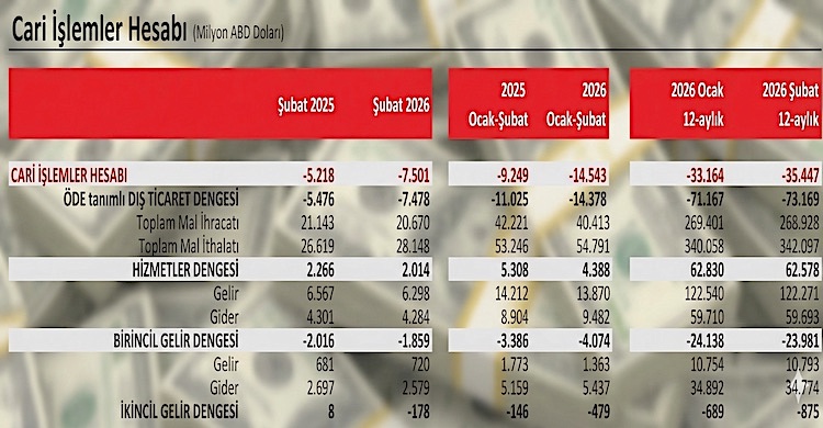 Ödemeler dengesi Şubat 2026 döneminde 7,5 milyar ABD doları açık verdi ve böylece iki aylık cari açık 14,5 milyar ABD doları düzeyine yükseldi.
