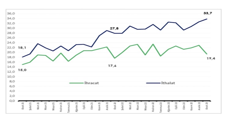 İthalat, yüzde 21,2 oranında artarak 33 milyar 742 milyon dolar oldu.