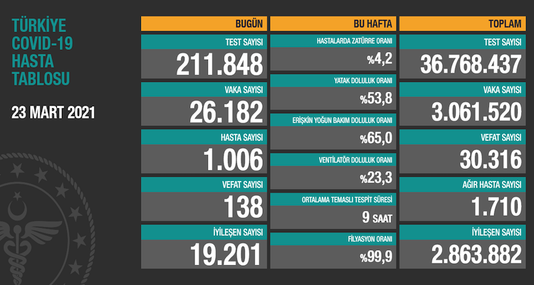 Türkiye’nin 23 Mart 2021 koronavirüs tablosu: 26 bini aşkın vaka tespit edildi