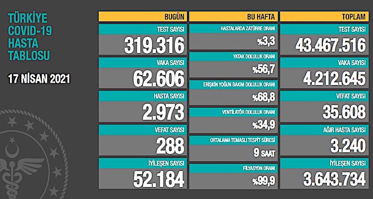 Türkiye’de son 24 saatte vaka sayısı 62 bin 606 oldu, 288 kişi koronavirüsten hayatını kaybetti.