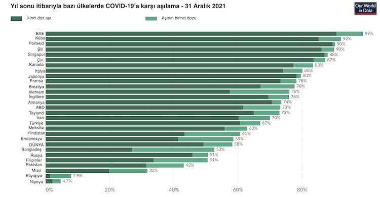 Oxford Üniversitesi rakamlarına göre, aşılamanın toplam nüfusa oranları Türkiye'de yüzde 66,9, İngiltere'de yüzde 75,9, ABD'de yüzde 73,2, Almanya'da yüzde 73,5, Fransa'da yüzde 78,2, Rusya'da yüzde 50,5, Hindistan'da yüzde 60,6, İtalya'da yüzde 80,1, Japonya'da yüzde 79,6, Birleşik Arap Emirlikleri'nde yüzde 99, Küba'da yüzde 92,1.