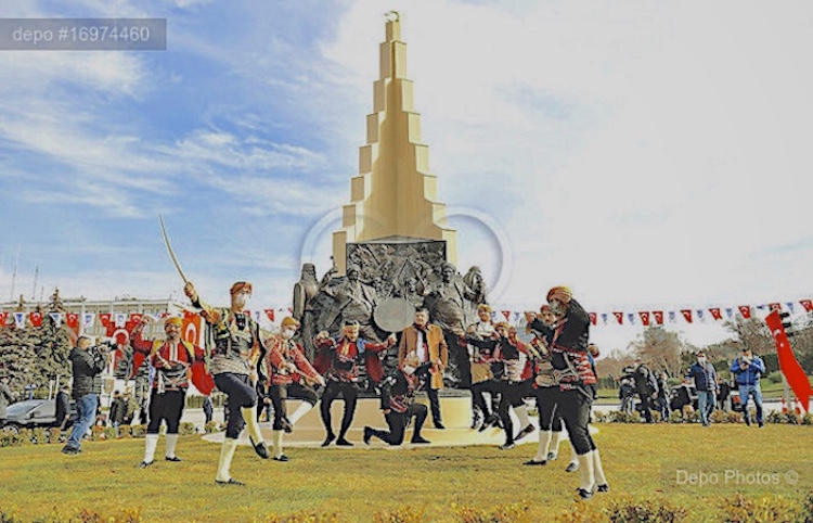 Heykeltıraş Aslan Başpınar tarafından yaklaşık 10 metre yüksekliğe ve 4 buçuk metre ene sahip cam elyaf takviyeli polyester malzemeden yapılan Anıt, 17 figür ve 1 rölyeften oluşuyor. Anıt’ın aşamalı mimari biçimi, 16 Türk devletini, Ay-Yıldız ise Türkiye Cumhuriyeti’ni temsil ediyor.