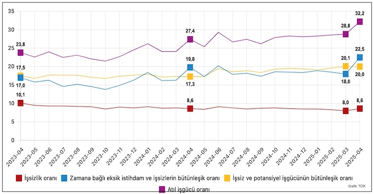 TÜİK verilerine göre Nisan ayında işsizlik oranı yüzde 8,6, "geniş tanımlı işsizlik" olarak tanımlana atıl işgücü oranı ise yüzde 32,2'ye yükseldi.