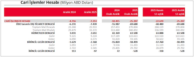 2025 yılındaki cari açık 25,2 milyar ABD doları, ödemeler dengesi tanımlı dış ticaret açığı ise 69,7 milyar ABD doları olarak hesaplandı.