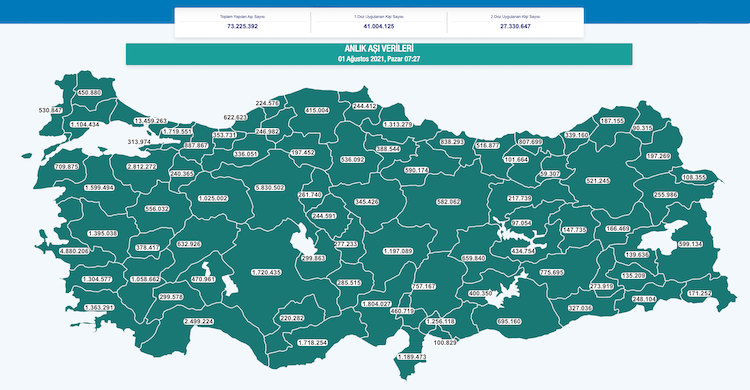 Türkiye nüfusunun yaklaşık yüzde 48,8'i birinci doz aşıya yaptırdı. Bu oran 18 yaş üstü nüfusta yüzde 66. Sağlık Bakanlığı verilerine göre, 1 Ağustos Pazar günü saat 07:25 itibarıyla uygulanan toplam aşı dozu 73 milyon 225 bin 392'ye ulaştı.