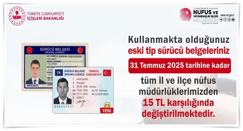 31.07.2025 tarihinde eski tip sürücü belgesi geçerlilik süresi sona ereceğinden yeni tip sürücü belgesi alınması gerekmektedir. Yönetmelik göre, "Belirlenen süre içerisinde değiştirilmeyen sürücü belgeleri geçersiz sayılır" hükmünü içeriyor.