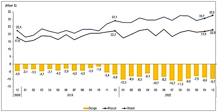 Aralık ayında dış ticaret açığı bir önceki yılın aynı ayına göre yüzde 42,0 artarak 6 milyar 832 milyon dolardan, 9 milyar 701 milyon dolara yükseldi. İhracatın ithalatı karşılama oranı 2021 Aralık ayında yüzde 76,5 iken, 2022 Aralık ayında yüzde 70,3'e geriledi.