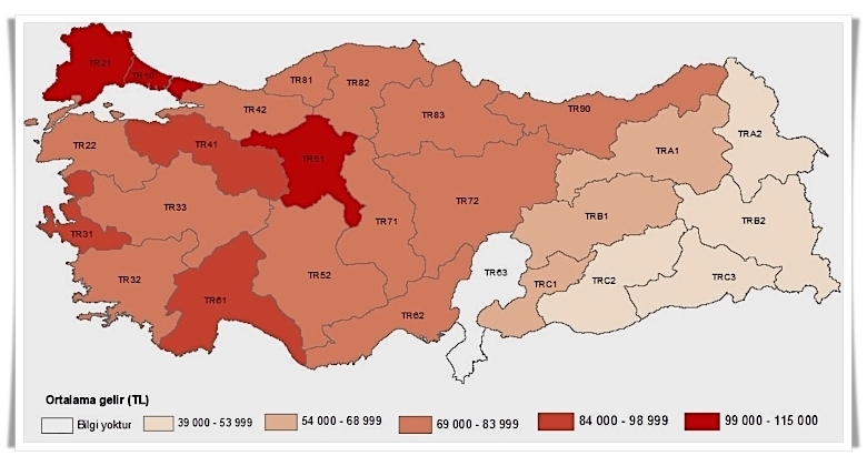 Son yapılan araştırma sonuçlarına göre P80/P20 oranı Türkiye'de 8,4 iken, bu değerin en düşük olduğu İBBS 2. Düzey bölgesi 5,3 ile TR81 (Zonguldak, Karabük, Bartın) olurken bu bölgeyi 5,4 ile TR42 (Kocaeli, Sakarya, Düzce, Bolu, Yalova) ve 5,5 ile TRB2 (Van, Muş, Bitlis, Hakkari) bölgeleri izledi.