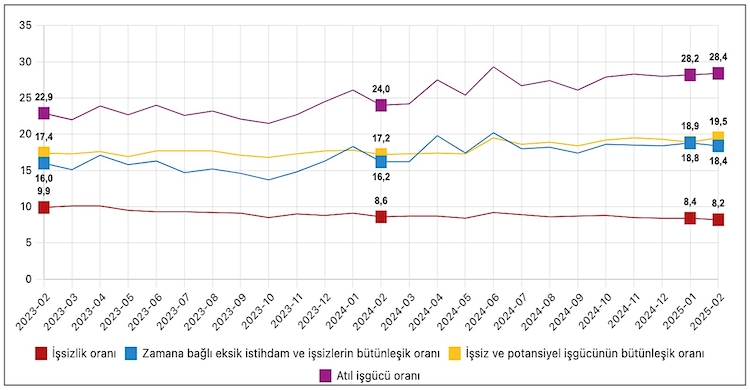 Zamana bağlı eksik istihdam, potansiyel işgücü ve işsizlerden oluşan atıl işgücü oranı 2025 yılı Şubat ayında bir önceki aya göre 0,2 puan artarak yüzde 28,4 oldu. Zamana bağlı eksik istihdam ve işsizlerin bütünleşik oranı yüzde 18,4 iken işsiz ve potansiyel işgücünün bütünleşik oranı yüzde 19,5 olarak tahmin edildi.