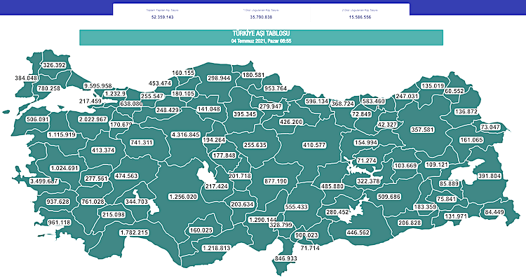 Sağlık Bakanlığı verilerine göre, 4 Temmuz Pazar günü saat 08:55 itibarıyla uygulanan toplam aşı dozu 52 milyon 359 bin 143'e ulaştı. Geçen hafta bu rakam 46 milyon 950 bin 508 doz idi. Son bir hafta 5 milyon 408 bin 636 yapıldı. Günlük ortalama 772 bin 662 olarak gerçekleşen uygulamada bazı günler 1 milyonun üzerine çıkıldı.