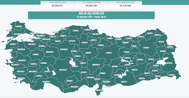 Türkiye nüfusunun yaklaşık yüzde 52,2'si birinci doz aşıya yaptırdı. Bu oran 18 yaş üstü nüfusta yüzde 70,6. Sağlık Bakanlığı verilerine göre, 15 Ağustos Pazar günü saat 08:20 itibarıyla uygulanan toplam aşı dozu 83 milyon 258 bin 571.