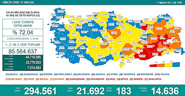 17 Ağustos koronavirüs ve aşı tablosu: 21 bin 692 yeni vaka, 183 vefat