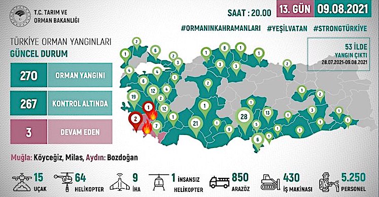 Böylece, son 13 günde, 53 ilde çıkan toplam 270 orman yangınının 268’i kontrol altına alındı ya da söndürüldü. Muğla'nın Köyceğiz ve Milas ilçelerindeki yangınların kontrol altına alınmasına yönelik çalışmalar ise sürüyor.