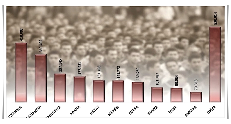 Suriyeliler o ilde yaşayanlara oranının yüksek olduğu bazı iller ise Gaziantep yüzde 13,09, Hatay yüzde 8,84, Şanlıurfa yüzde 8,10 ve Mersin yüzde 7,12 şeklinde sıralanıyor.