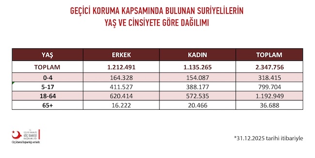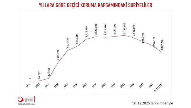 Geçici koruma statüsündeki Suriyeli sayısı 2024 yılı sonunda 2 milyon 901 bin 478 kişi iken 2025 yılı sonu itibarıyla 2 milyon 347 bin 756 kişiye düştü. Buna göre geçici koruma statüsündeki Suriye sayısı bir yılda 553 bin 722 kişi azaldı ve bunların ülkelerine döndüğü tahmin ediliyor.