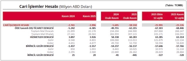 Türkiye Cumhuriyet Merkez Bankası'nın (TCMB) açıkladığı verilere göre Kasım ayında cari işlemler hesabı 3 milyar 996 milyon ABD doları açık kaydetti. Böylece 2025 yılının Ocak-Kasım dönemindeki on bir aylık cari açık 18 milyar 510 milyon ABD doları düzeyine ulaştı.