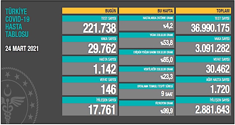 Türkiye’nin 24 Mart 2021 koronavirüs tablosu: