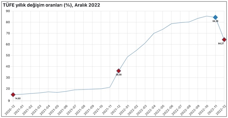 TÜİK'e göre, Yİ-ÜFE (2003=100) 2022 yılı Aralık ayında bir önceki aya göre yüzde 0,24 azaldı. Bir önceki yılın aynı ayına göre yüzde 97,72 ve on iki aylık ortalamalara göre yüzde 128,47 artış gösterdi.