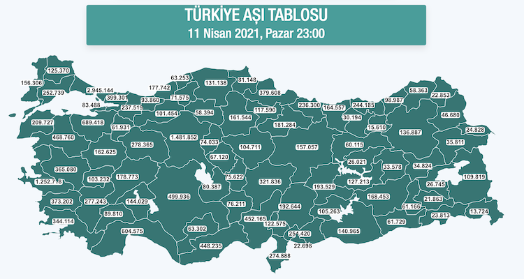 Mart ayı sonu itibarıyla Türkiye nüfusunun yaklaşık 84 milyon 339 bin kişi olduğu tahmin ediliyor. Buna göre, Türkiye nüfusunun yaklaşık yüzde 13'ü aşının birinci dozunu yaptırmış durumda. İkinci doz aşıyı yaptırarak aşılama işlemi tamamlayanların toplam nüfus içindeki oranı ise yaklaşık yüzde 9.