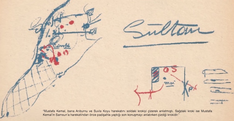 Mustafa Kemal’in, Arıburnu Zaferi”ni anlatırken çizdiği şemayla ilgili Büyükelçi Sherril'in kitaptaki açıklaması şöyle: “Arıburnu ve Suvla Körfezi (Gelibolu Yarımadası). Bu şema iki muharebeyi birlikte gösteriyor. Güneyde, Arıburnu'nda, kırmızı renkte 19'uncu tümenin üç kol (kırmızı renk), halinde dağılımını gösteriyor; birincisi, sağa doğru İngilizlere karşı taarruzda, ikincisi ortaya doğru ilerlerken, üçüncüsüyse, en önemlisi olan, kuzeyden bir taşma hareketiyle, İngilizlerin sol kanadına saldırıyor. Kuzeyde, Suvla Körfezi (S) ve çift Avustralya kolunun, Mustafa Kemal tarafından muzafferiyetle savunulacak olan, Anafartalar tepelerine saldırmaları.”