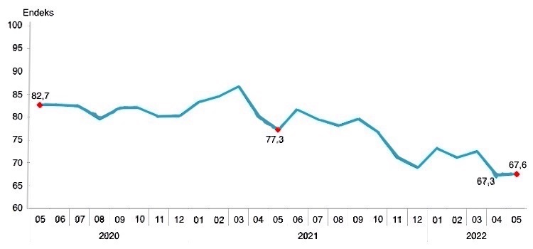 Mevsimsel etkilerden artırılmış tüketici güven endeksi, 2022 yılının ilk ayında 73,2 oldu. Şubat'ta 71,2 ve Mart'ta 72,5 olarak açıklanan endeks Nisan'da ayında 67,3 ile son 16 yılın en düşük değerine düştü. Tüketici güven endeksi Mayıs ayında ise 0,3 puanlık bir yükselişle 67,6 oldu.