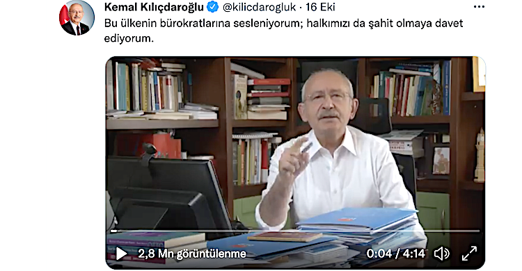 Kılıçdaroğlu, sosyal medya hesabından paylaştığı video mesajında, "Sevgili halkım, bugün devletimize hizmet eden memurlarımıza, yanı bürokratlarımıza önemli bir hususta seslenmek istiyorum. Sizi de buna şahitlik etmeye davet ediyorum'' diyerek, şunları söyledi: