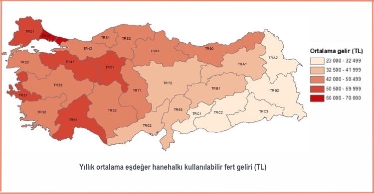 Bu bölgeyi, 59 bin 798 TL ile TR51 (Ankara) bölgesi ve 59 bin 272 TL ile TR31 (İzmir) bölgesi izledi. En düşük yıllık ortalama eşdeğer hanehalkı kullanılabilir fert geliri ise 23 bin 063 TL ile TRB2 (Van, Muş, Bitlis, Hakkari) bölgesinde gerçekleşti.