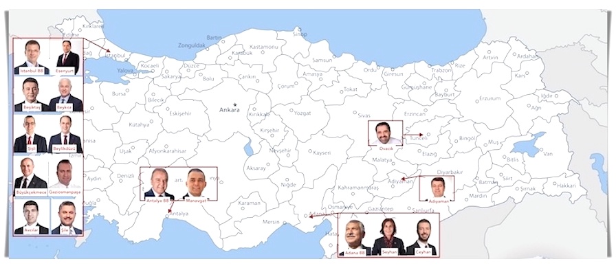 CHP'de seçilen ve görevden uzaklaştırılan belediye başkanlarından üçü büyükşehir (İstanbul, Adana ve Antalya), biri il (Adıyaman) ve 13'ü ilçe belediye başkanı.