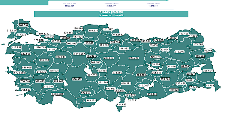 Sağlık Bakanlığı verilerine göre, 20 Haziran Pazar günü saat 08:00 itibarıyla yapılan aşı dozu sayısı 41 milyon 22 bin 927 oldu. Uygulanan aşıdan 26 milyon 676 bin 877'ünü birinci doz aşı oluşturuyor.