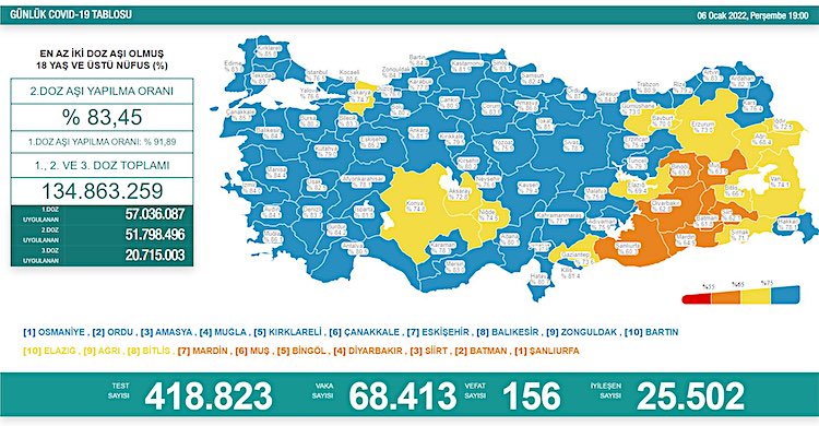 Sağlık Bakanı Fahrettin Koca’nın paylaştığı günlük Covid-19 tablosundaki verilere göre, son 24 saatte 418 bin 823 test yapıldı ve 68 bin 413 yeni vaka tespit edildi. Can kaybı 156 kişi olarak istatistiklere yansıdı. İyileşen hasta sayısı ise 25 bin 502 oldu.