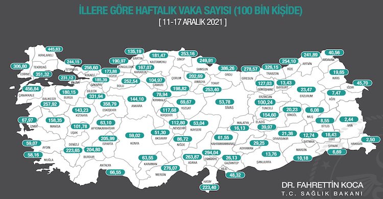 Sağlık Bakanı Fahrettin Koca, Twitter hesabından ''11-17 Aralık arasında, 100.000 kişi içinde bir haftalık toplam yeni Covid-19 vaka sayısı il bazında neydi? Bilgiler, haftalık İnsidans haritasında'' mesajına paylaştı.