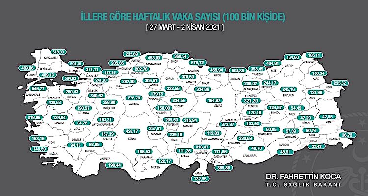 27 Mart-2 Nisan arasında il bazındaki Covid-19 vaka sayılarına göre, her 100 bin kişide en yüksek vaka sayısı Samsun’da 678,72 ile kaydedildi.