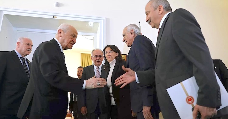 Bahçeli, MHP Grubu'nu ziyaret eden TBMM Meclis Başkanvekili Sırrı Süreyya Önder ve DEM Parti Van Milletvekili Pervin Buldan'dan oluşan "İmralı heyeti" ile Ahmet Türk'ü makam odasının kapısında karşıladı.