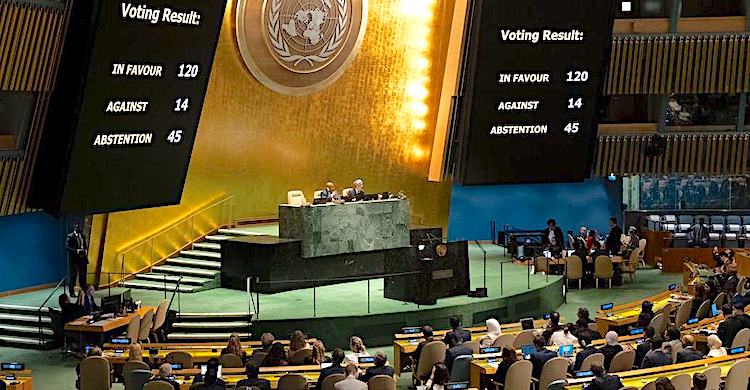 Bağlayıcı niteliği bulunmayan kararı 193 üyeli BM Genel Kurulu'nda 120 üye kabul ederken, 14 üye reddetti. 45 üye ise çekimser kaldı. Bazı ülkeler ise oylamaya katılmadı.