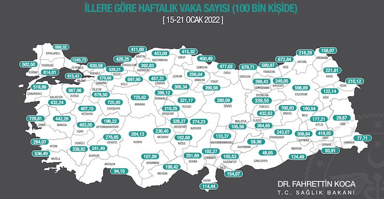 Bakan Koca’nın açıkladığı verilere göre, 15-21 Ocak 2022 tarihleri arasında her 100 bin kişide en yüksek vaka sayısı bu hafta da İstanbul'da 1.245,73 ile kaydedildi. İstanbul'da bu sayı geçen hafta 1.571,46 idi.