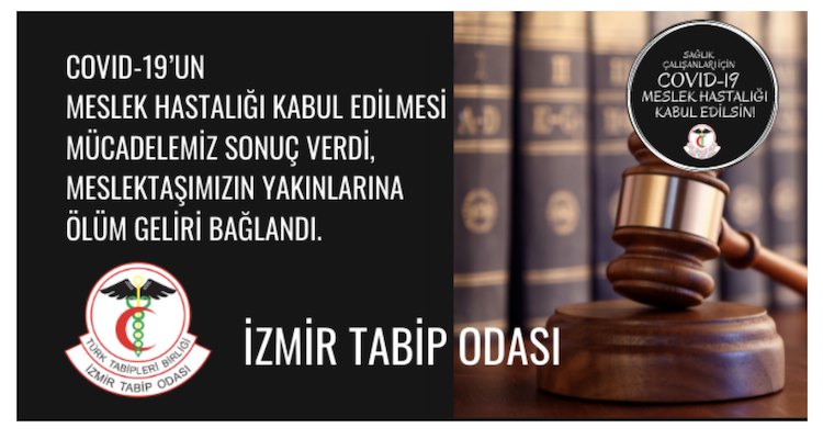 Sağlık çalışanları sivil toplum kuruluşlarının Covid-19'un meslek hastalığı sayılabilmesi için yapılan girişimler ilk olumlu sonucunu verdi. İzmir Tabip Odası', İzmir’de işyeri hekimi olarak görev yapmakta iken, Covid-19 Pandemisinin ilk günlerinde hastalığa yakalanarak 4 Nisan 2020'de vefat eden Dr. Muharrem İdiz'in ailesine SGK'dan ölüm geliri bağlanmasını sağladı.