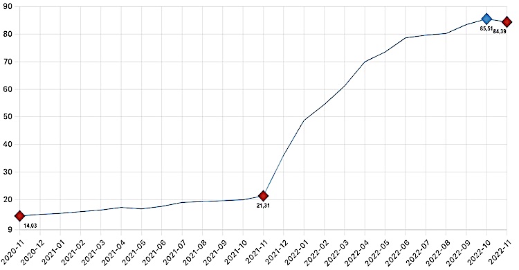TÜFE'deki (2003=100) değişim 2022 yılı Kasım ayında bir önceki aya göre yüzde 2,88, bir önceki yılın Aralık ayına göre yüzde 62,35, bir önceki yılın aynı ayına göre yüzde 84,39 oldu.