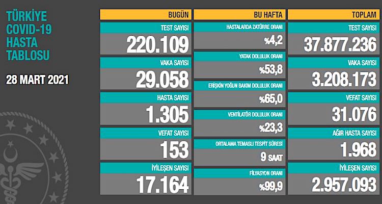Türkiye’nin 28 Mart 2021 koronavirüs tablosu: Toplam vaka 3.2 milyonu aştı