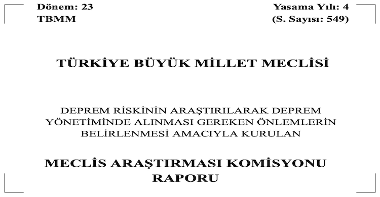 "Kamuoyunda “TBMM Deprem Komisyonu olarak da bilinen Deprem Riskinin Araştırılarak Deprem Yönetiminde Alınması Gereken Önlemlerin Belirlenmesi Amacıyla Kurulan Meclis Araştırması Komisyonu’nun her iki yılda bir toplanarak 2010 senesinde çalışma yapan bu Komisyonun Raporunda yer alan önerilerin güncellenmesi sağlanmalı, veya, deprem (afet) zararlarının azaltılması ile ilgili TBMM’de bir daimi komisyon kurularak afetler konusunun sürdürülebilir bir şekilde değerlendirileceği bir kurumsal düzenleme yapılmalıdır."