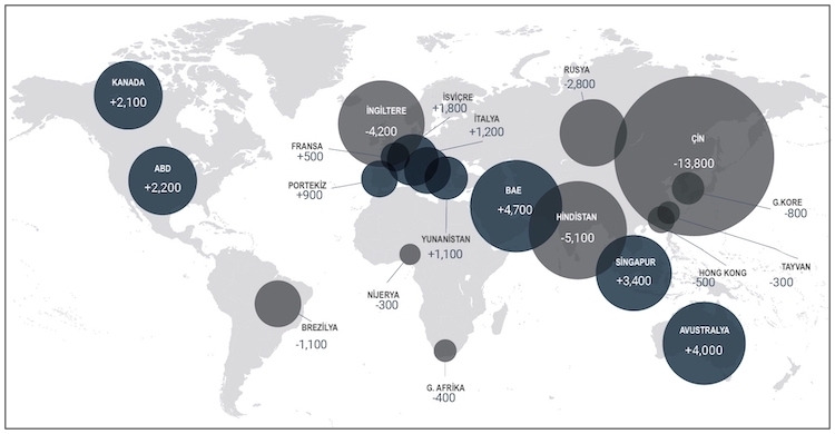 Güncel bir rapora göre servet çıkışında Çin ilk sırada yer alıyor ve onu İngiltere izliyor. Birleşik Arap Emirlikleri (BAE) ise dünyanın servet mıknatısı olmaya devam ediyor.