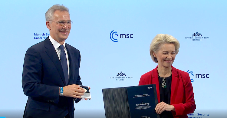Von der Leyen, NATO Genel Sekreteri Stoltenberg'e konferansın plaketini verdi.