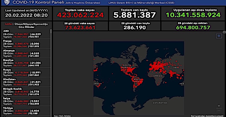 Johns Hopkins Üniversitesi verilerine göre, küresel düzeydeki Covid-19 vakası sayısı 20 Şubat saat 08:20 itibarıyla 423 milyon 62 bin 224. Geçen hafta bu rakam 410,2 milyon olarak kayıtlarda yer almıştı. Bir haftalık vaka artışı 13,4 milyonu biraz geçti.
