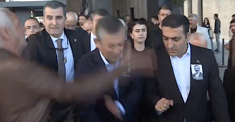 Özgür Özel, TBMM Başkanvekili Sırrı Süreyya Önder'in cenaze törenine katıldıktan sonra AKM'dan ayrıldı. Korumalarının arasında AKM'den çıkışı sırasında yanına yaklaşan bir kişinin sağ eliyle Özgür Özel'in alnına vurduğu görülüyor.