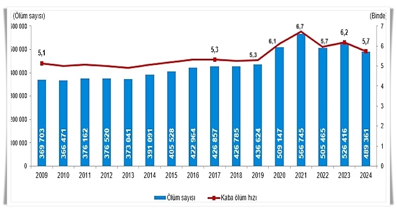 Bin kişi başına düşen ölüm sayısını ifade eden kaba ölüm hızı, 2023 yılında binde 6,2 iken 2024 yılında binde 5,7 oldu. Diğer bir ifade ile 2023 yılında bin kişi başına 6,2 ölüm düşerken 2024 yılında bin kişi başına 5,7 ölüm düştü.