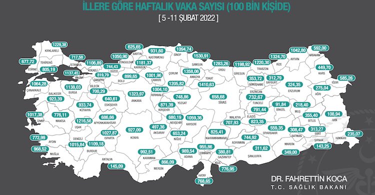 Sağlık Bakanı Fahrettin Koca, Twitter hesabından, ''5-11 Şubat arasında, 100.000 kişi içinde bir haftalık toplam yeni Covid-19 vaka sayısı il bazında neydi? Bilgiler, haftalık İnsidans haritasında'' mesajını paylaştı.