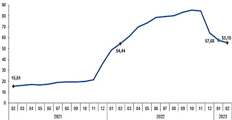 Şubat ayında tüketici fiyat endeksi (TÜFE) yıllık yüzde 55,18 arttı.