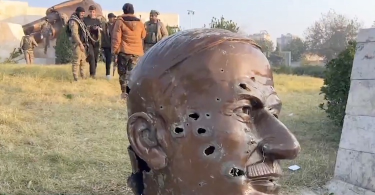 İsyancılar kutlama için havaya ateş açtı ve gençler, ordunun bir hafta süren baş döndürücü geri çekilmesiyle toprak kontrolü çöken Suriye Devlet Başkanı'nın posterlerini yırttı.