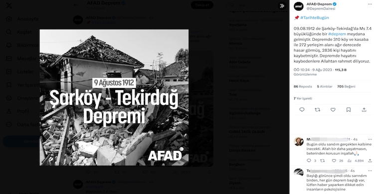 AFAD'ın sosyal medya hesabından yapılan paylaşımda, 1912 yılındaki deprem hatırlatılarak, şu bilgiye yer verildi: