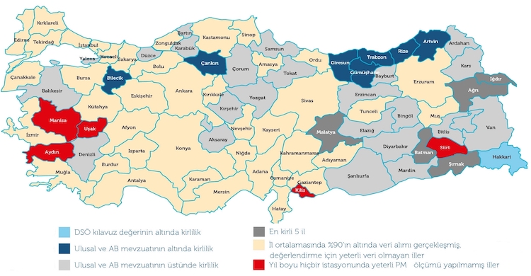 Havayı kirleten en önemli maddelerden partikül madde PM10 değerlerine bakıldığında, 2021’de en kirli havayı soluyan ilk beş il sırasıyla, Batman, Iğdır, Ağrı, Şırnak ve Malatya oldu. Bu illerde yıllık ortalamalar, Dünya Sağlık Örgütü’nün (DSÖ) partikül madde PM10 için belirlediği 15 μg/m3 olan kılavuz değerin 5-8 katıydı. 200 günden fazla günde ise PM10 için yönetmelikte belirlenen 40 μg/m3 ulusal limit değerinin üstünde hava kirliliği ölçüldü.
