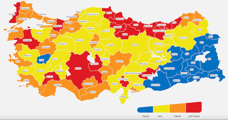 3- Yüksek riskli iller (turuncu-22 il): Antalya, Ardahan, Artvin, Bolu, Bilecik, Çanakkale, Düzce, İstanbul, İzmir, Karaman, Kayseri, Kırıkkale, Kırklareli, Kilis, Kocaeli, Kütahya, Mersin, Muğla, Niğde, Tekirdağ, Yalova, Zonguldak.